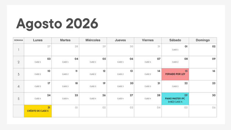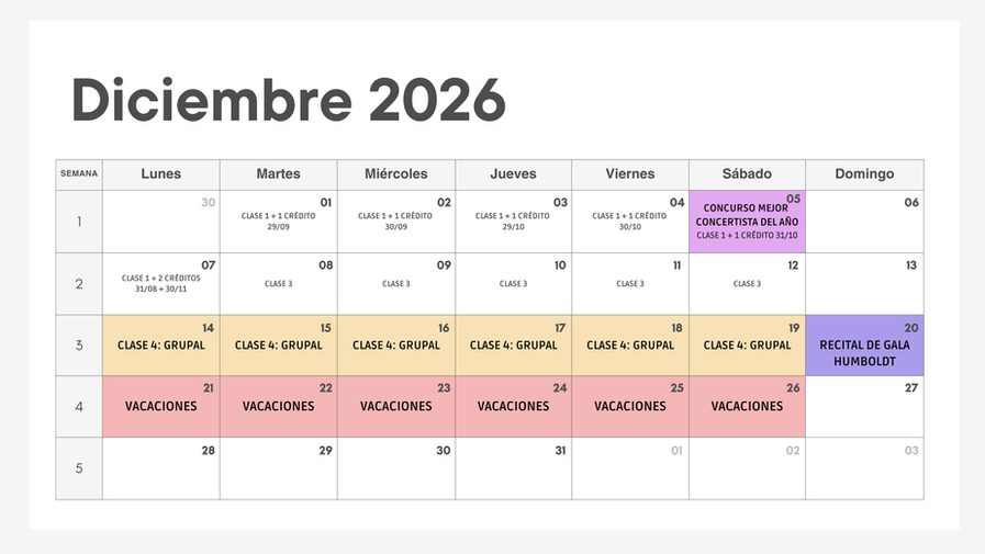 Clases adicionales correspondientes al programa, no incluidas dentro de los honorarios regulares. Estas se canjean exclusivamente durante el período de clases del mes de diciembre.